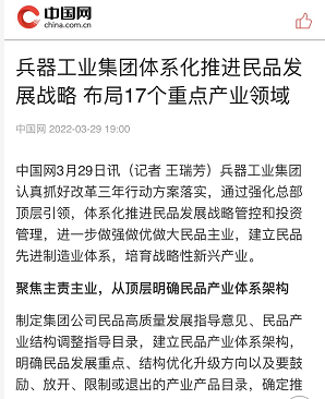 中國網(wǎng):兵器工業(yè)集團體系化推進民品發(fā)展戰(zhàn)略 布局17個重點產(chǎn)業(yè)領域