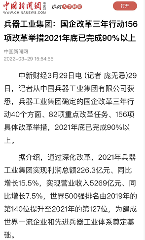 中國新聞社:兵器工業(yè)集團:國企改革三年行動156項改革舉措2021年底已完成90%以上
