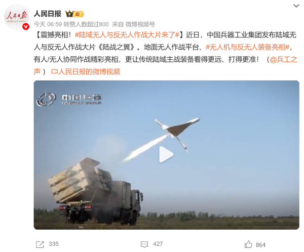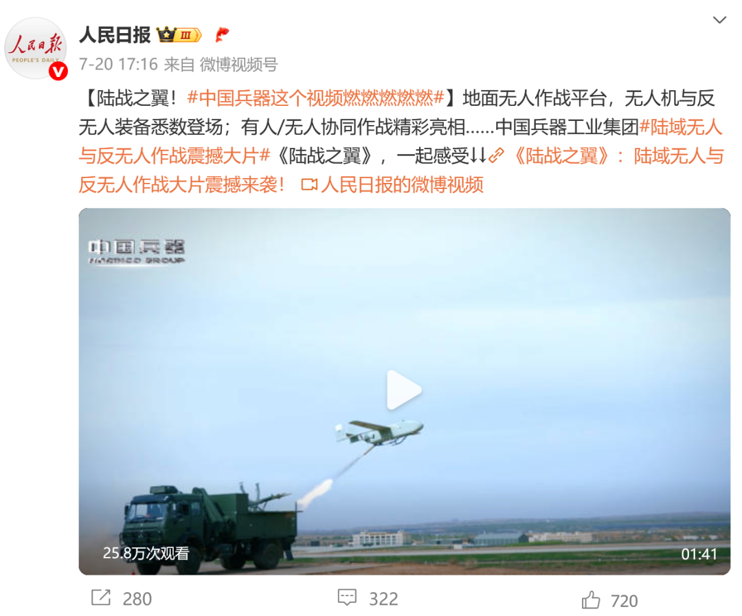7月21日,中國兵器工業(yè)集團(tuán)有限公司在位于內(nèi)蒙古的某試驗(yàn)場舉辦軍貿(mào)陸域無人與反無人作戰(zhàn)體系主題日活動,攜無人機(jī)、巡飛彈、反無人機(jī)等最新武器裝備登場亮相,展現(xiàn)了一場無人與反無人領(lǐng)域激烈對抗的實(shí)戰(zhàn)場景。中央主流媒體、地方媒體、知名網(wǎng)絡(luò)媒體,以及集團(tuán)公司各宣傳平臺紛紛進(jìn)行報(bào)道,多次登上熱搜,引發(fā)廣泛關(guān)注。