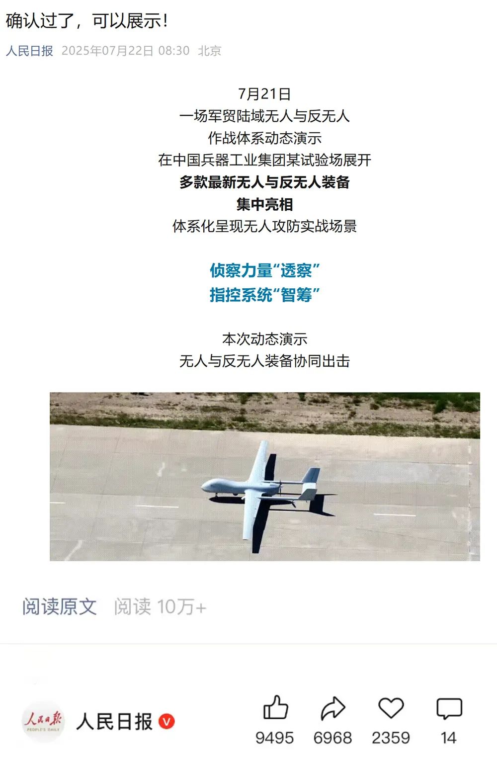 人民日報(bào)微博、央視軍事微博、央視新聞客戶端、中國新聞網(wǎng)、中新社國是直通車抖音、環(huán)球網(wǎng)微博、環(huán)球時報(bào)(X平臺、英文版客戶端)、中國日報(bào)網(wǎng)、央視軍事報(bào)道微博、中國軍號微博、中央廣播電視總臺“空天逐夢”微信視頻號、共青團(tuán)中央B站、國資小新微博等中央主流媒體、國家部委的新媒體播發(fā)集團(tuán)公司陸域無人與反無人作戰(zhàn)大片等視頻作品。