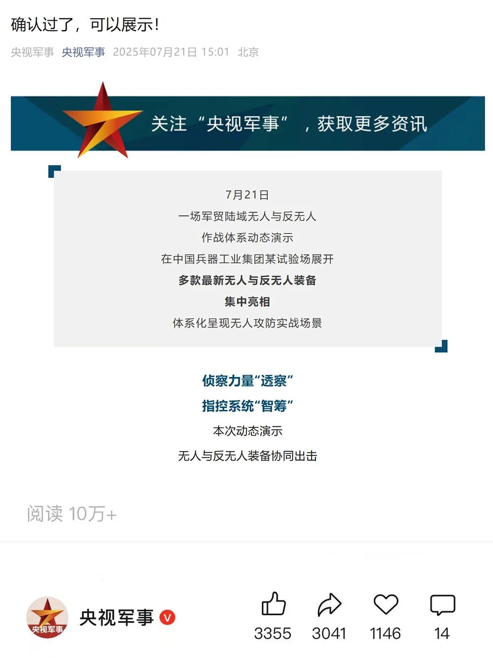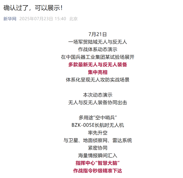 央視新聞客戶端:兵器工業(yè)集團(tuán)陸域無人與反無人作戰(zhàn)體系震撼來襲!搶先看!2025-07-24